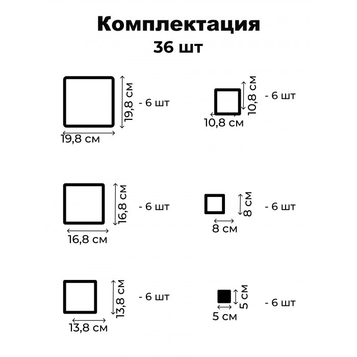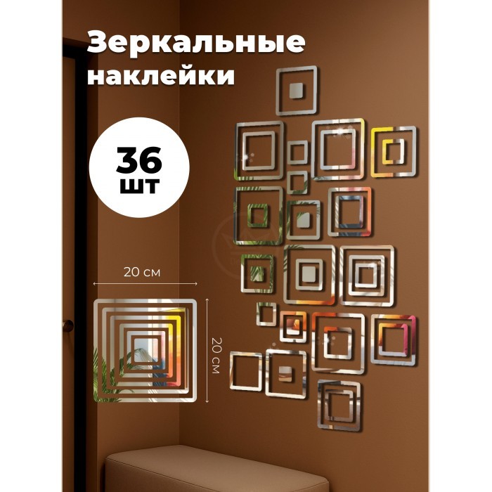 Интерьерные зеркальные наклейки Квадрат-Разборный (36шт), 20*20/17*17/14*14/11*11/8*8/5*5см ) серебро 265976